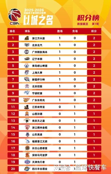 CBA首轮后最新排名出炉!广厦第1广东第10 辽宁居第4四川垫底